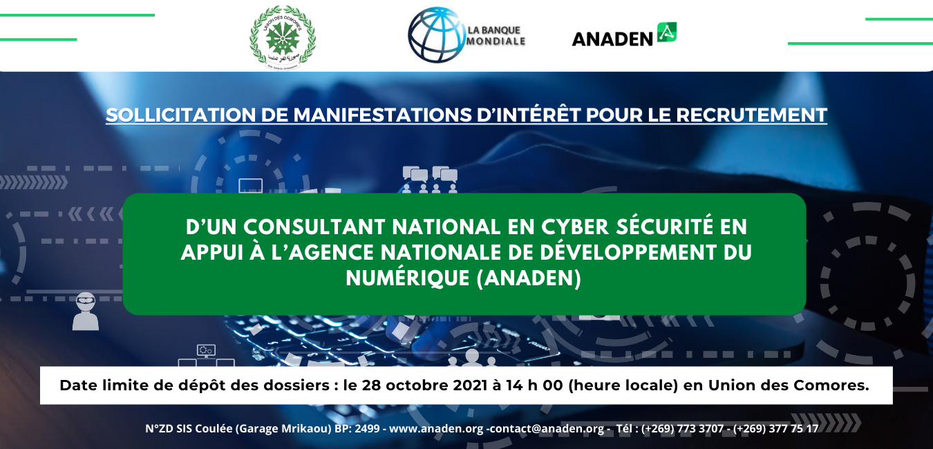 Sollicitation de Manifestations d’Intérêt pour le Recrutement d’un consultant Individuel International en Cyber Sécurité en appui à l’ANADEN